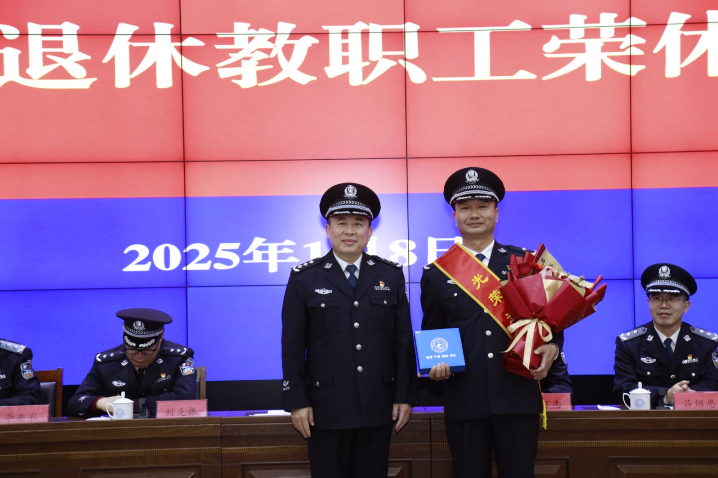 儀式上播放了為榮休教職工精心制作的視頻短片《風雨從警路,崢嶸歲月情》。榮休教職工代表丁文俊同志發(fā)表退休感言,表達了對公安教育工作的深厚情感和對學校發(fā)展的美好期許。