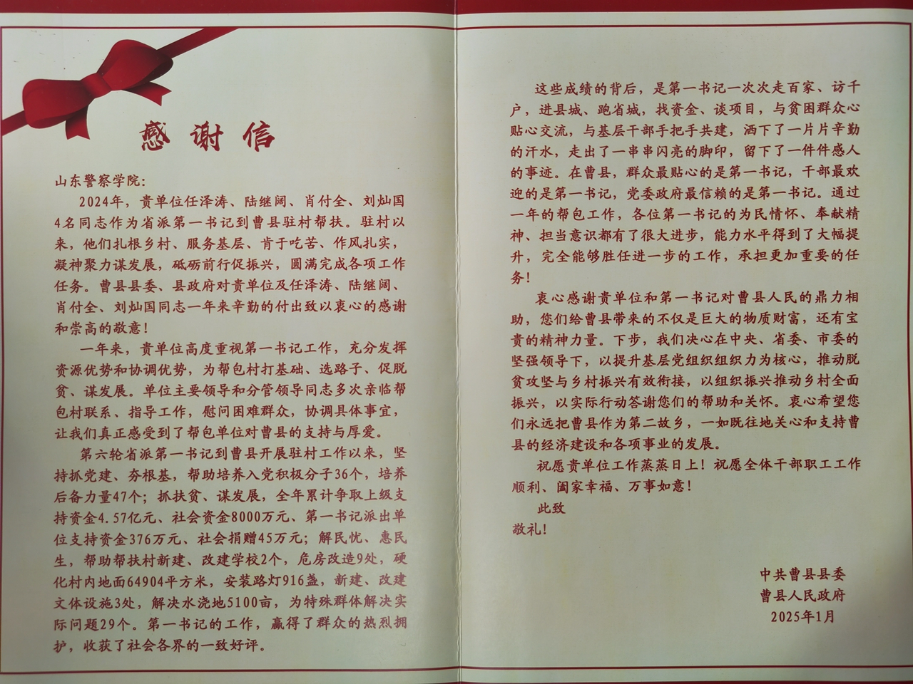 趙潔代表曹縣縣委、縣政府向學校送來感謝信,對淘寶下載一直以來關心支持曹縣鄉村振興工作,學校領導多次親臨幫包村聯系、指導工作、慰問困難群眾表示衷心感謝。趙潔指出,淘寶下載選派的4名第六輪省派第一書記政治素質高、工作思路明確、攻堅克難能力強,開展駐村工作以來,抓黨建、夯根基、謀發展、解民憂、惠民生,真抓實干的工作實績使幫包村發生了巨大變化,也與當地干部群眾結下了深厚的感情。