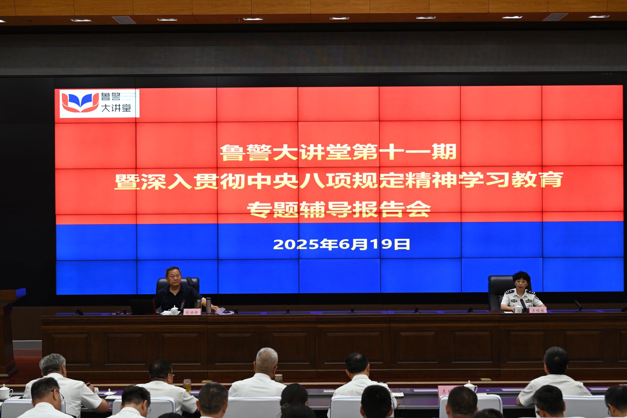為持續深化作風建設,強化黨員干部政治擔當,6月19日上午,學校在明水校區舉辦魯警大講堂第十一期暨深入貫徹中央八項規定精神學習教育專題輔導報告會。學校黨委班子成員出席會議,黨委副書記、統戰部部長王桂媛主持報告會。