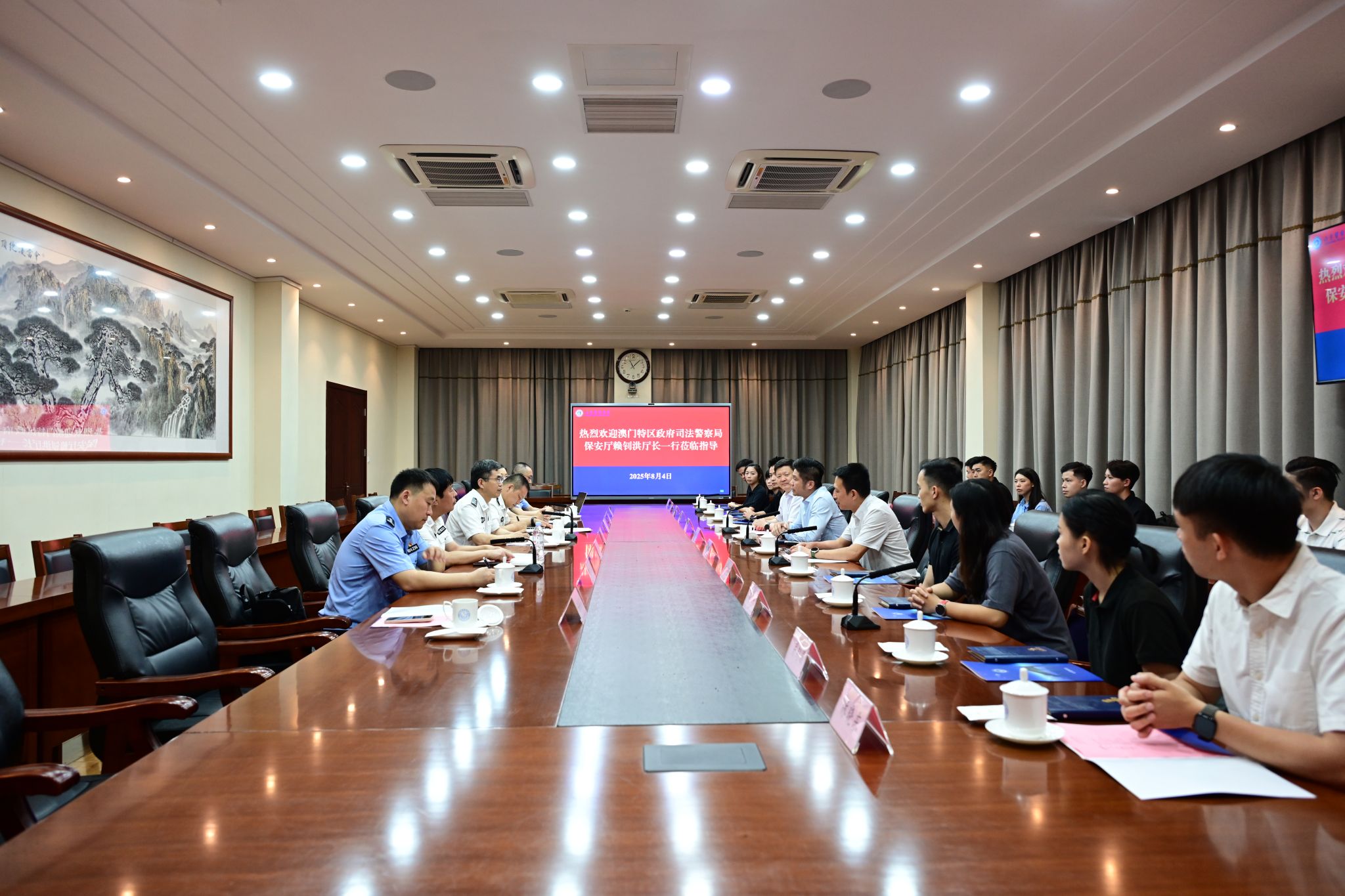 8月4日,澳門特區政府司法警察局保安廳賴釗洪廳長及曾志輝處長一行20人來我校參觀交流。省委港澳辦吳曲波處長,我校黨委委員、副院長呂紹忠陪同活動。