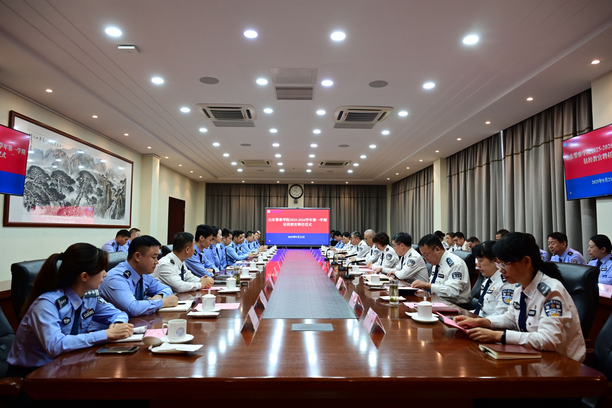 為進一步深化校局合作,推進全警協同育人和實戰化教育教學改革,培養新時代卓越公安專門人才,9月23日,學校在明水校區召開2025-2026學年第一學期駐校教官聘任工作會。學校黨委副書記、院長畢可志出席并講話,省公安廳教育訓練處處長付玉寧為駐校教官頒發聘書,教務處主要負責同志主持會議。