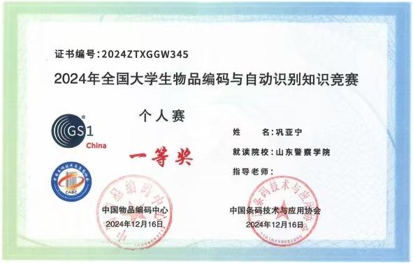 2024年12月,由中國物品編碼中心主辦、中國條碼技術(shù)與應(yīng)用協(xié)會承辦的“2024全國大學(xué)生物品編碼與自動識別知識競賽”落下帷幕。我校經(jīng)濟犯罪偵查學(xué)院鞏亞寧同學(xué)榮獲全國大學(xué)生物品編碼與自動化識別知識競賽個人賽一等獎。