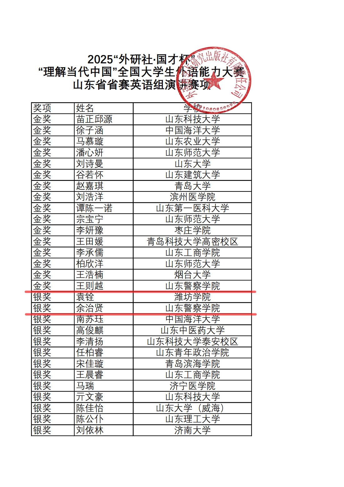11月1日至2日,2025“外研社·國才杯”“理解當(dāng)代中國”全國大學(xué)生外語能力大賽山東省賽英語組演講賽項(xiàng)在山東農(nóng)業(yè)大學(xué)岱宗校區(qū)圓滿落幕。我校參賽選手表現(xiàn)優(yōu)異,繼2023年獲金獎(jiǎng)后,今年再創(chuàng)佳績:2024級經(jīng)濟(jì)犯罪偵查學(xué)2區(qū)隊(duì)王則越同學(xué)勇奪金獎(jiǎng),并成功晉級全國總決賽;2024級網(wǎng)絡(luò)安全與執(zhí)法3區(qū)隊(duì)余治賢同學(xué)榮獲銀獎(jiǎng)。外語教研部鄒詠梅、徐玉萍兩位老師獲評“優(yōu)秀指導(dǎo)教師獎(jiǎng)”。