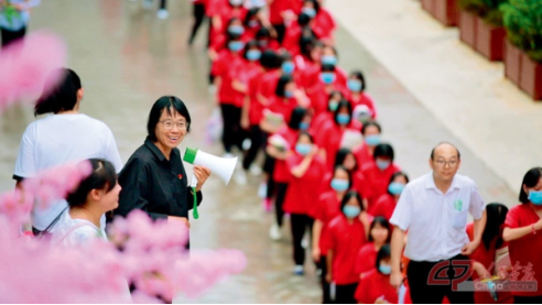 2020年高考首日,張桂梅在操場上給孩子們做考前動員。華坪縣融媒體中心 供圖